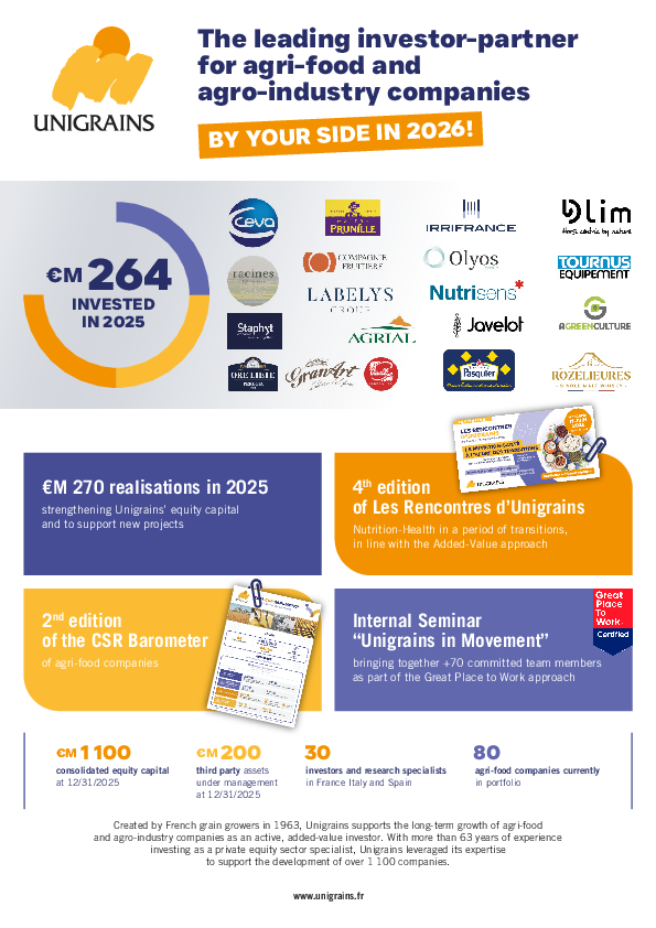 Creada y participada mayoritariamente por los productores de cereales franceses (AGPB y AGPM), Unigrains asocia a su capital los principales bancos franceses, como Crédit Agricole, BNP Paribas y Société Générale, así como diversas organizaciones francesas procedentes del mundo cooperativo agrícola.